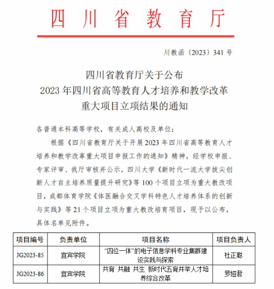 近日,四川省教育厅公布了2023 年四川省高等教育人才培养和教学改革重大项目立项名单,我校2个项目获得立项,立项数在同类高校中名列前茅。